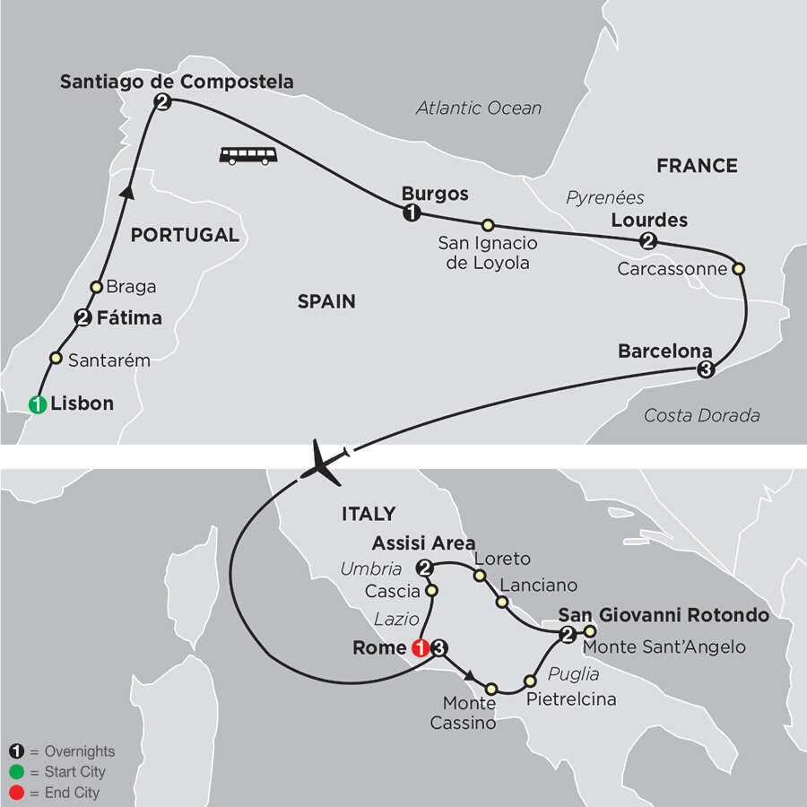 Reaffirm and celebrate your faith on this Portugal, Spain, France, and Italy tour with overnights in Lisbon, Fátima, Santiago de Compostela, Burgos, Lourdes, Barcelona, Rome, San Giovanni Rotondo, and the Assisi area. Along the way, visit some of the world’s most famous shrines, pilgrimage sites, and spiritual places.Santiago de Compostela has been known as a pilgrimage site since the 9th century. Spend two nights here and visit St. James’ Cathedral, where you’ll have the opportunity to attend Mass. You’ll also attend Mass in Fátima, home to one of the most famous Catholic shrines; in Rome at St. Mary Major Basilica, the most important Roman church dedicated to the Virgin Mary; in San Giovanni Rotondo’s Old Church; in Assisi’s St. Francis Basilica; in St. Francis’ church in Lanciano; and in the 17th-century Sanctuary of Loyola, built to honor the founder of the Jesuits. Join pilgrims for the Rosary and candlelight processions in Fátima and in Lourdes, another of the world’s most famous pilgrimage places, where you’ll also enjoy a guided walking tour. Other highlights of this faith-based tour are visits to Monte Sant’Angelo, one of Christendom’s most celebrated shrines, and Jeronimos Monastery, dating to the mid-1400s. In Carcassonne, visit the medieval fortified citadel and marvel at the ramparts, castle walls, and drawbridges. In Burgos, visit the cathedral where El Cid is buried. In Barcelona, visit the Sagrada Familia, Gaudi’s masterpiece. In Braga, one of the world’s oldest Christian cities, visit Bom Jesus do Monte Sanctuary, where devout followers have walked the “Stations of the Cross” since 1811. In Rome, attend the Papal audience (subject to availability) and visit the world-famous Colosseum. All of this and much more are included on this inspirational Portugal, Spain, France, and Italy tour designed for value-minded travelers.