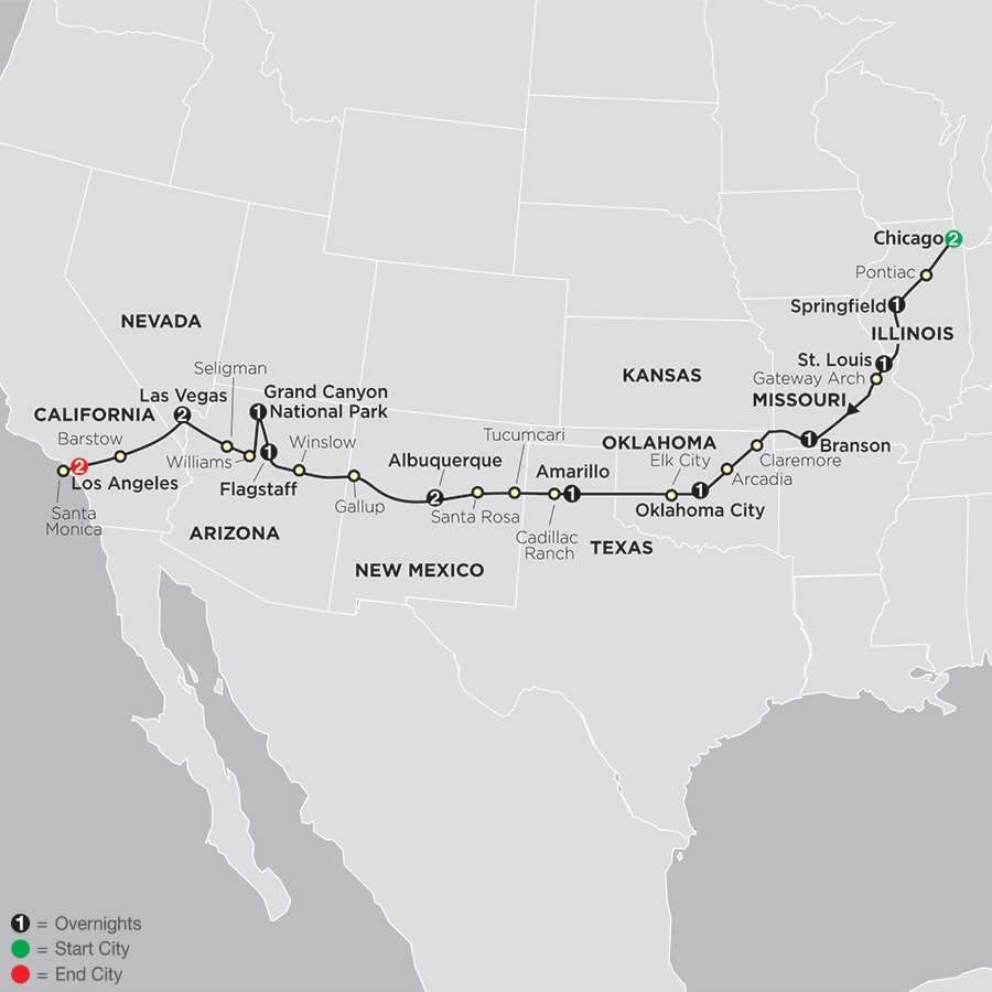 Follow legendary Route 66 and see how Americans traveled from the 1920s through the 1960s. This historic route begins in Chicago, travels through eight states, and ends in Los Angeles. On this Route 66 tour, you’ll get the opportunity to travel to some of the cities along Route 66, visit many of the Route 66 museums, and step back in time to when the journey was part of the fun.Visit Pontiac’s Route 66 Hall of Fame & Museum, featuring memorabilia from the heyday of Route 66. In Oklahoma, visit Pops, a landmark building selling gas, sodas, shakes, and diner food. At the National Route 66 Museum in Elk City, antique cars and historic documents help you feel what it was like to travel Route 66. In New Mexico, visit Russell’s Car Museum, featuring classic cars and memorabilia. Travel though Williams—in Arizona—listed in the National Register for Historic Places and where you’ll see neon signs of the intact circa 1940s “Motel Row.” Before arriving at the end of Route 66 in Santa Monica, California, visit the Barstow Route 66 Museum, which houses a collection of historic Route 66 artifacts and photographs. In Albuquerque, be part of the Albuquerque Balloon Fiesta. Stand in awe as you experience the morning’s pre-dawn opening ceremonies and the unforgettable Mass Ascension, where hundreds of hot air balloons take off, turning the sky into a virtual rainbow of colors. It is spectacular! This tour also deviates from Route 66, so you can see breathtaking scenery at the Grand Canyon and experience the excitement of Las Vegas. These are just some of the many highlights of this Route 66 tour designed for value-minded travelers. Sit back, relax, and let Cosmos handle the driving and details while you enjoy!
