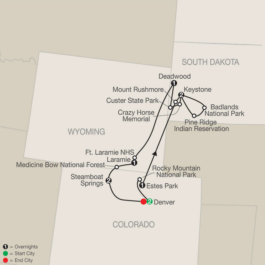DENVER Sightseeing including Red Rocks Amphitheater; Buffalo Bill Grave & Museum; [LF] dinner at the historic Buckhorn Exchange ROCKY MOUNTAIN NATIONAL PARK Sightseeing ESTES PARK Orientation tour MOUNT RUSHMORE Visit Mount Rushmore National MemorialPINE RIDGE INDIAN RESERVATION Sightseeing with Local Guide; [LF] visit the Red Cloud Indian School & Heritage CenterBADLANDS NATIONAL PARK Sightseeing CUSTER STATE PARK Buffalo safari CRAZY HORSE MEMORIAL SightseeingDEADWOOD Sightseeing with a Local Guide FORT LARAMIE NATIONAL HISTORIC SITE Sightseeing MEDICINE BOW NATIONAL FOREST Scenic drive STEAMBOAT SPRINGS Sightseeing; farewell dinner at a local restaurant