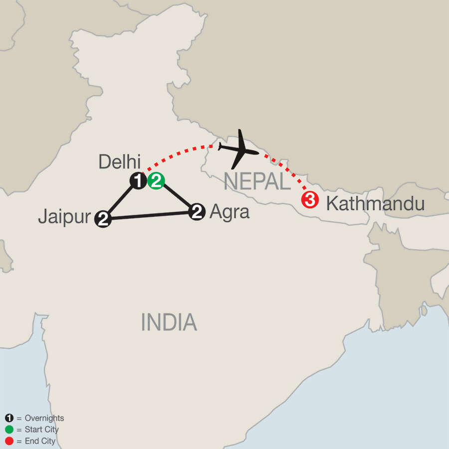 DELHIVisit Qutub Minar, Humayan’s Tomb, and Gurudwara Bangla Sahib; rickshaw ride through Chandni Chowk bazaarAGRAVisit the Taj Mahal at sunrise by tonga & Agra FortJAIPURVisit the City Palace & Museum, Jantar Mantar, Hawa Mahal, and Amber FortKATHMANDUSightseeing with a Local Guide; visit Hanuman Dhoka, the Temple of Kumari, and Boudhanath; excursion to Patan including Durbar Square; Host service during your stay