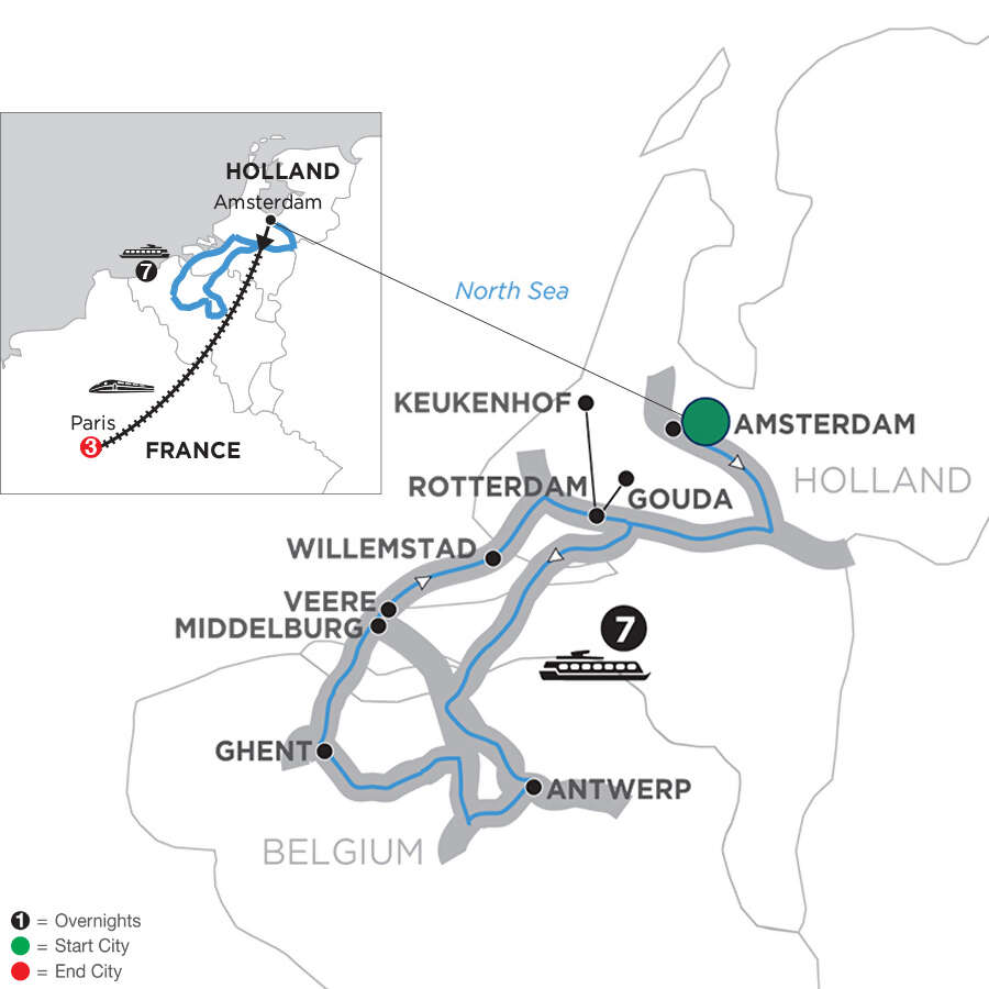 Day 1 Amsterdam (Embarkation): onboard welcome receptionDay 2 Rotterdam. Rotterdam harbor cruise: choice of guided sightseeing in Gouda, or visit to Keukenhof GardensDay 3 Antwerp: choice of guided sightseeing, or visit the Arboretum KalmthoutDay 4 Ghent: choice of guided sightseeing, visit St. Baaf’s Cathedral, or visit the Nature Reserve ZwinDay 5 Middelburg–Veere. Excursion to the Delta Works: guided walk in Middelburg; guided tour of the Delta WorksDay 6 Willemstad: time at leisure; cheese tasting on boardDay 7 Amsterdam: visit to flower auction; canal cruise or visit Amsterdam secret gardensDay 8 Amsterdam (Disembarkation)—Paris, France: transfer to Paris by high speed trainDay 9 Paris: guided sightseeingDay 10 Paris: full day at leisureDay 11 Paris: your vacation ends with breakfast this morning