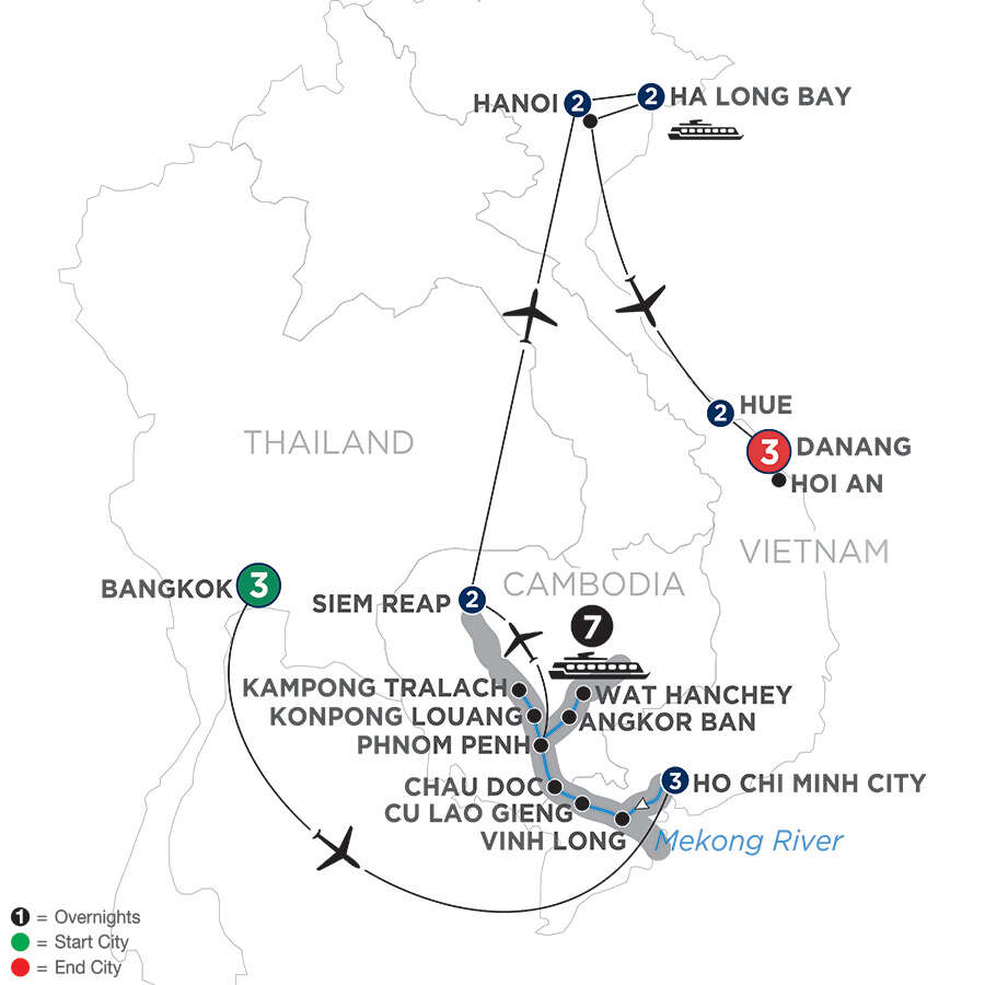 Day 1 Bangkok: Welcome to ThailandDay 2 Bangkok: Boat ride on klongs; visit the Grand Palace, Temple of the Emerald Buddha, and the Temple of the Reclining BuddhaDay 3 Bangkok: Day at leisureDay 4 Bangkok–Ho Chi Minh City: fly to Ho Chi Minh CityDay 5 Ho Chi Minh City: Walking tour; visit the famous Rex Hotel for a drink, War Remnants Museum, and Ben Thanh Market; cooking classDay 6 Ho Chi Minh City: Cu Chi Tunnels excursionDay 7 Ho Chi Minh City (Embarkation): Onboard welcome receptionDay 8 Vinh Long–Cu Lao Gieng: Visit a local workshop to see how rice paper, rice wine, and traditional candy are made in Vinh Long; visit a sampan-making family and interact with a Catholic priest in Cu Lao GiengDay 9 Chau Doc–Long Khanh A–Cambodian Border Crossing: Visit a local market and the religious sites at Sam Mountain in Chau Doc; walking tour of Long Khanh A with cotton-weaving demonstrationDay 10 Phnom Penh: Sightseeing by private cyclo, including the Royal Palace, Silver Pagoda, and the National Museum; afternoon at leisure; show by children from a local orphanage Day 11 Phnom Penh: Visit the Tuol Sleng Genocide Museum and visit one of the Cambodian Killing FieldsDay 12 Wat Hanchey –Angkor Ban: Visit Wat Hanchey and partake in a traditional water blessing by local monks; walking tour in Angkor Ban with school visitDay 13 Konpong Louang–Kampong Tralach: Visit the silversmith village of Konpong Louang; ox cart ride through the countryside, and visit a local farmer’s home in Kampong TralachDay 14 Phnom Penh (Disembarkation)–Siem Reap: Fly to Siem Reap; visit Angkor Wat, Angkor Thom, and Bayon TempleDay 15 Siem Reap: Visit Ta Prohm, Banteay Srei, and a noodle-making village; Apsara dance performanceDay 16 Siem Reap–Hanoi: Fly to HanoiDay 17 Hanoi: Visit Ho Chi Minh’s mausoleum, One Pillar Pagoda, and Temple of Literature; lunch at Koto; electric cart ride through the Old Quarter; water puppets performanceDay 18 Hanoi–Ha Long Bay (Embarkation): Drive to Ha Long Bay; visit Cua Van floating villageDay 19 Ha Long Bay: Cruise the bay; visit Ti Top Island, Luon Cave, and Dark and Bright Cave; opportunity to explore by kayakDay 20 Ha Long Bay (Disembarkation)–Hanoi–Hue: Drive to Hanoi; fly to HueDay 21 Hue: Visit the Imperial Citadel, Thien Mu Pagoda, and the tombs of the Nguyen EmperorsDay 22 Hue–Danang: Drive to Danang; visit the Cham Museum and Monkey MountainDay 23 Danang: Excursion to Hoi An including a cruise on the Thu Bon River and a walking tour of the Ancient Town Day 24 Danang: Day at leisure Day 25 Hanoi: End of vacation