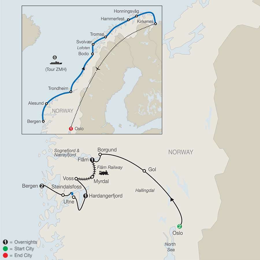 OSLO Welcome dinner; guided sightseeing, walk through Frogner Park and visit City HallGOLSee the medieval stave churchBORGUND Admire the stave churchFLÅM[LF] Ride the spectacular Flåm trainMYRDAL-VOSSBy trainHARDANGERFJORD [LF] Overnight stay at the Ullensvang HotelUTNEFerry crossingSTEINSDALSFOSSMarvel at the spectacular waterfallsBERGEN Orientation; walking tour of Bryggen; [LF] ride the Fløybanen funicularHeadsets throughout the tour